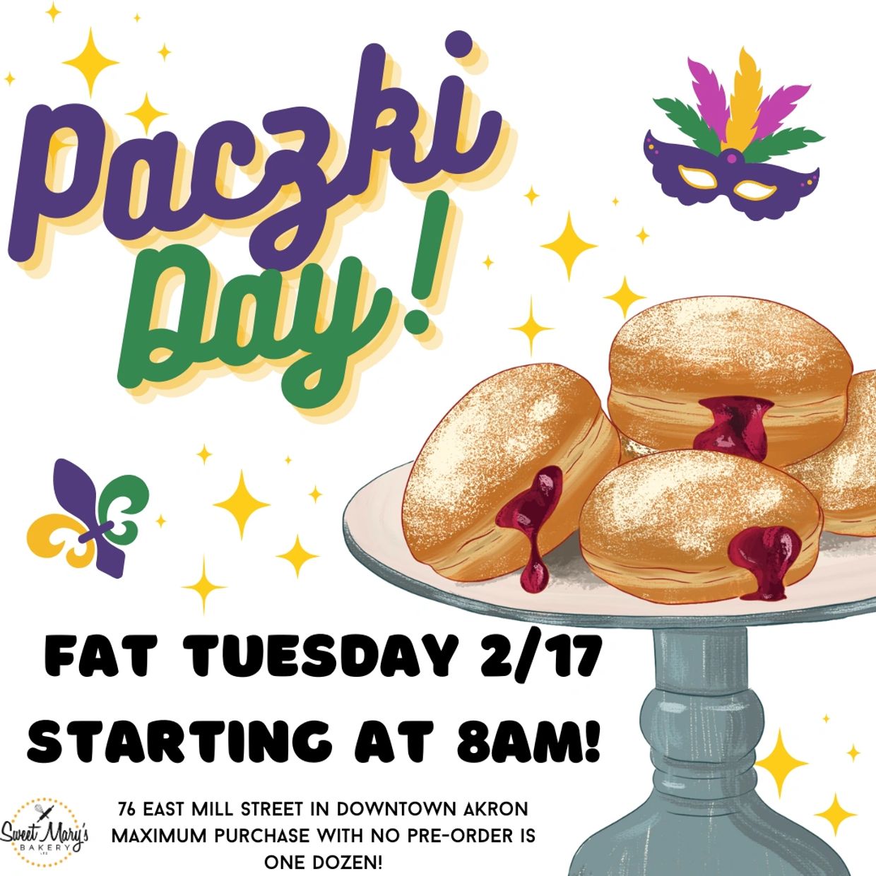 Our first day of Paczki will be Thursday 2/12, for walk-in purchase only. Pre-order pickups begin on Friday, 2/13! We will be CLOSED on Monday 2/16, and will be open special hours from 8am - 2pm (or sold out) on Tuesday 2/17.